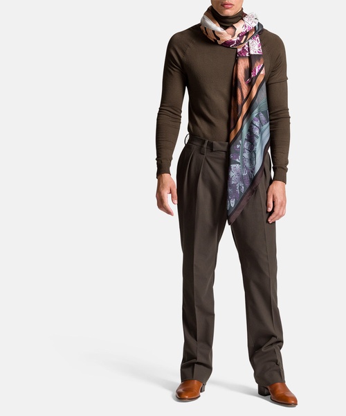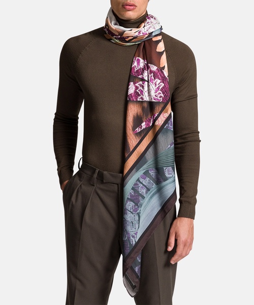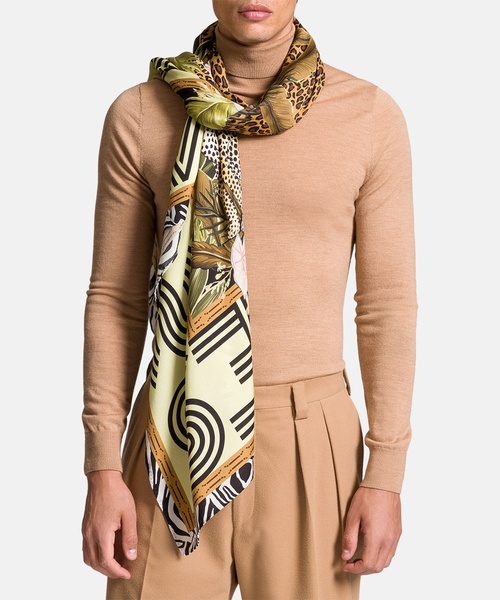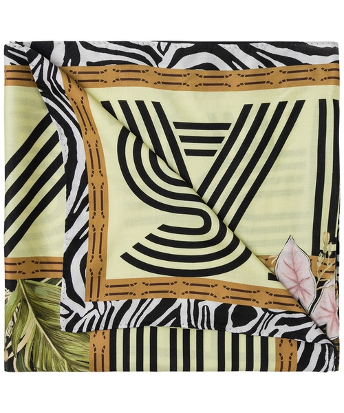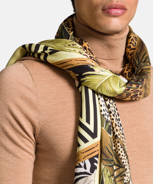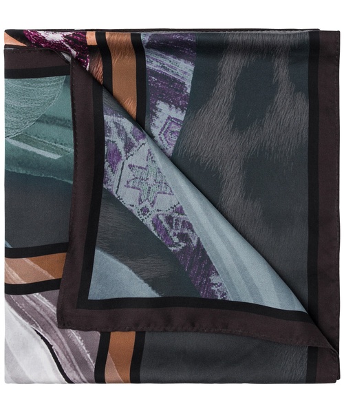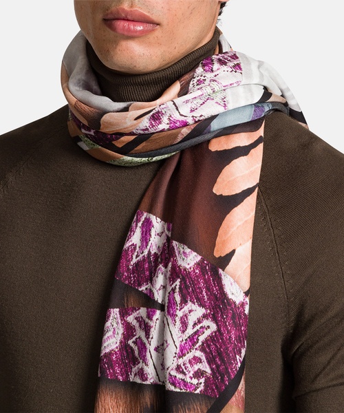 Elegantes Tuch in weich fließender Materialqualität. Mit dem abstrakten, variierenden Print harmoniert das integrierte Logo. Dezent schließen die Seiten mit einem schmalen Saum.