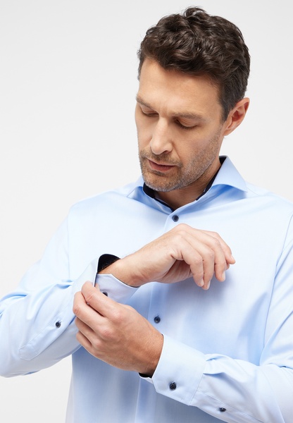Dieses COVER SHIRT ergänzt perfekt Ihren blauen oder dunkelblauen Anzug.